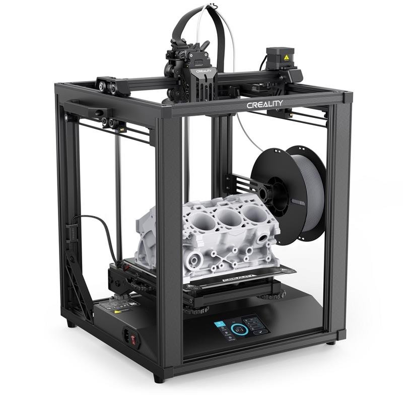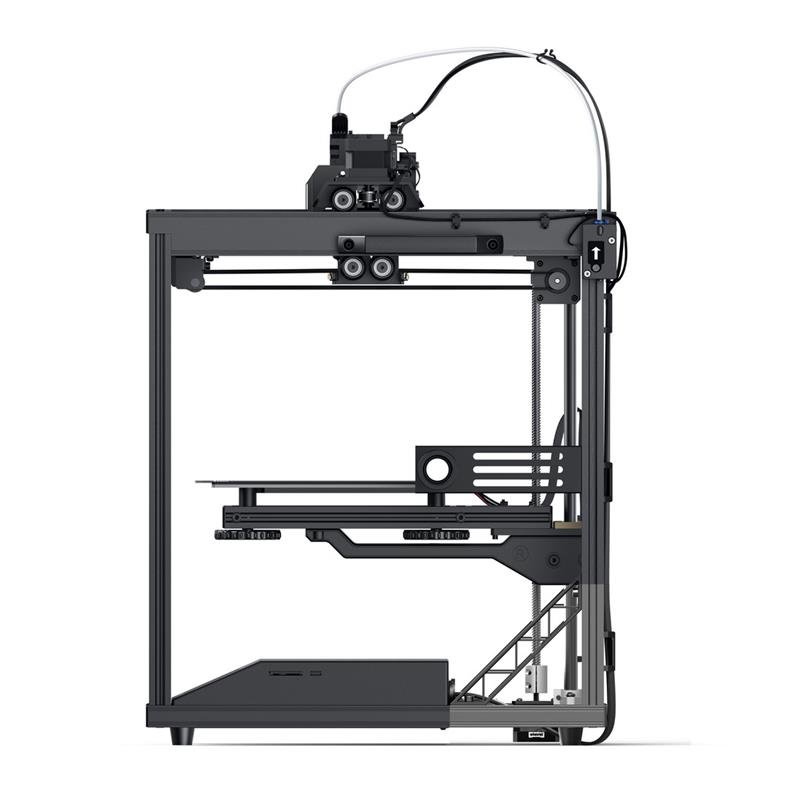 Un bastidor cúbico totalmente metálico acompaña a la clásica estructura cartesiana. La estabilidad se ve reforzada por ejes lineales gruesos, refuerzos adicionales, dos voladizos y soportes de cama de silicona.