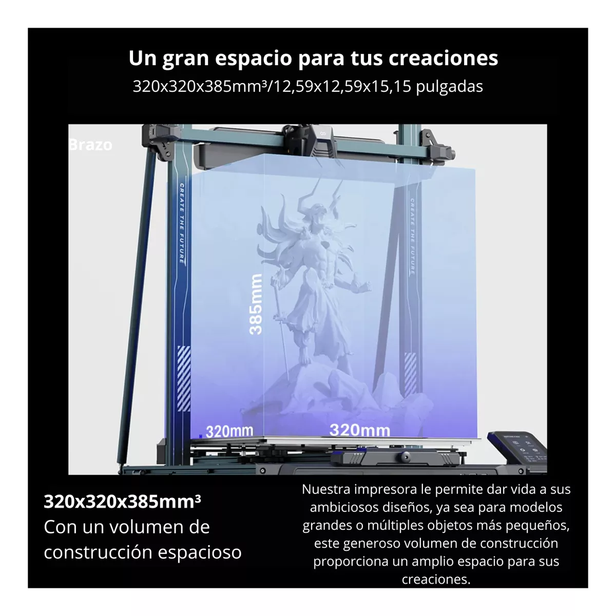 Da rienda suelta a tu creatividad con un generoso volumen de construcción de 320x320x385 mm/12,59×12,59×15,15 pulgadas. Esta área de impresión considerable le permite crear modelos más grandes o varios objetos más pequeños en una sola impresión, ampliando sus posibilidades creativas.