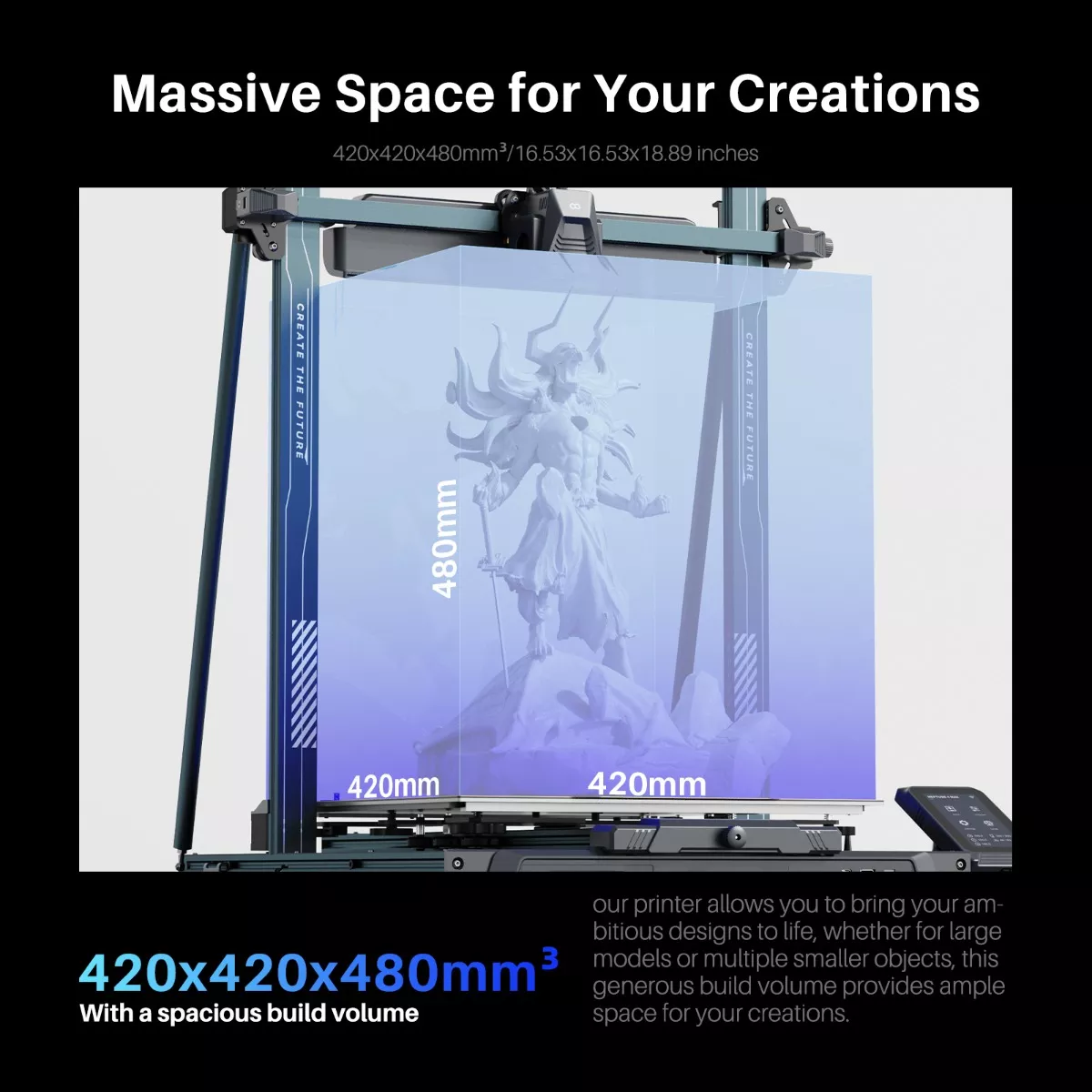 Con un espacioso volumen de construcción de 420 x 420 x 480 mm, nuestra impresora le permite dar vida a sus ambiciosos diseños, ya sea para modelos grandes o múltiples objetos más pequeños, este generoso volumen de construcción proporciona un amplio espacio para sus creaciones.
