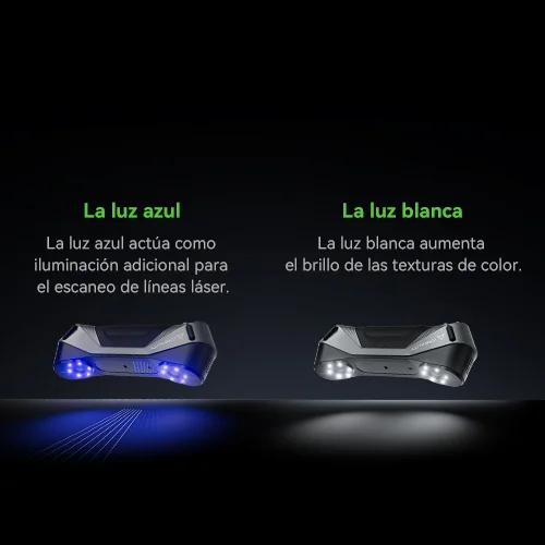 Modo de escaneo: Luz azul (láser azul de 7 líneas)/NIR (luz estructurada binocular infrarroja)Modo de Luz azul (láser azul de 7 líneas)Exactitud: Hasta 0.02mm @ 100mm [1]Resolución: 0.02-2mmVelocidad de Escaneo: Hasta 60fpsMínimo Volumen de Escaneo: 5mm x 5mm x 5mmRango de Captura Única: 270mmx170mm@300mmDistancia de Trabajo: 150mm-400mmMapeo de Colores: SíModos de Alineación: Marcador>>NIR (luz estructurada binocular infrarroja)Exactitud: Hasta 0.1mm